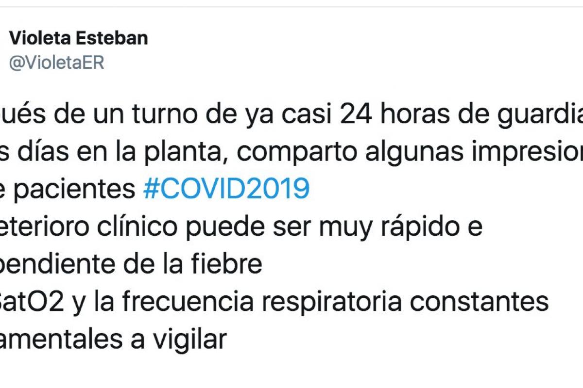 Esteban explica que ha estado “casi 24 horas de guardia y varios días en planta” y que ha observado que el “deterioro clínico” de los enfermos “puede ser muy rápido e independiente de la fiebre”.