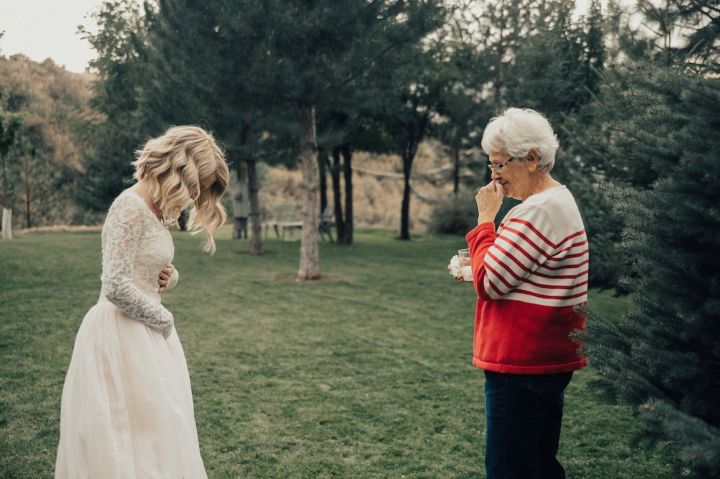 "La abuela ni siquiera sabía que la novia tenía el vestido en su poder. Jordyn y yo nos salimos de la cena y la ayudé a que se pusiera el vestido y se preparara", explica Kortney a la edición estadounidense del HuffPost. "Le dijimos a su abuela que saliera de la cena y le enseñamos una foto suya antigua en la que llevaba el vestido que se iba a mostrar en la boda".