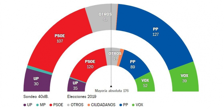 El sondeo de 40dB para 'El País' y la SER otorga la mayoría a unos populares que no sumarían mayoría absoluta con los de Abascal, mientras el PSOE crece ligeramente.
