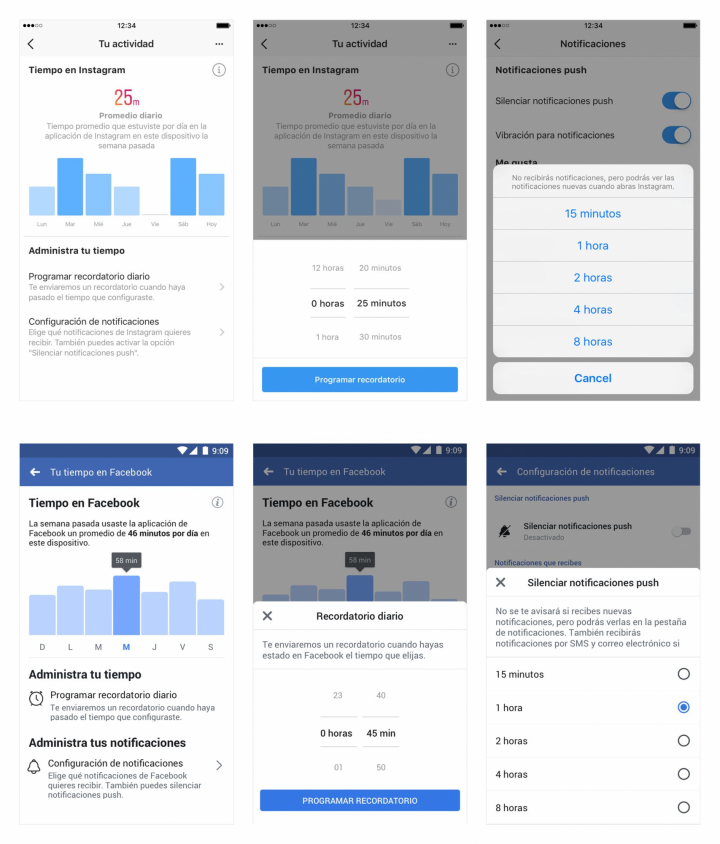 Instagram y Facebook permitirán a sus usuarios medir el tiempo que pasan a lo largo del día utilizando estas redes sociales. Con ello, la compañía quiere ayudar a que la gente administre su tiempo en conciencia, según ha explicado David Cuen, director de Comunicación de EMEA de Instagram. Las herramientas —que han sido desarrolladas a partir de la colaboración con expertos, organizaciones de salud mental, investigaciones y el feedback de la comunidad— aún no están disponibles, pero llegarán pronto a las actualizaciones de ambas aplicaciones para Android y iOs.