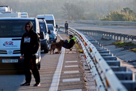 Varios conductores esperan fuera de sus vehículos durante la retención que ha provocado en la autopista AP-7 el corte que han realizado grupos independentistas.