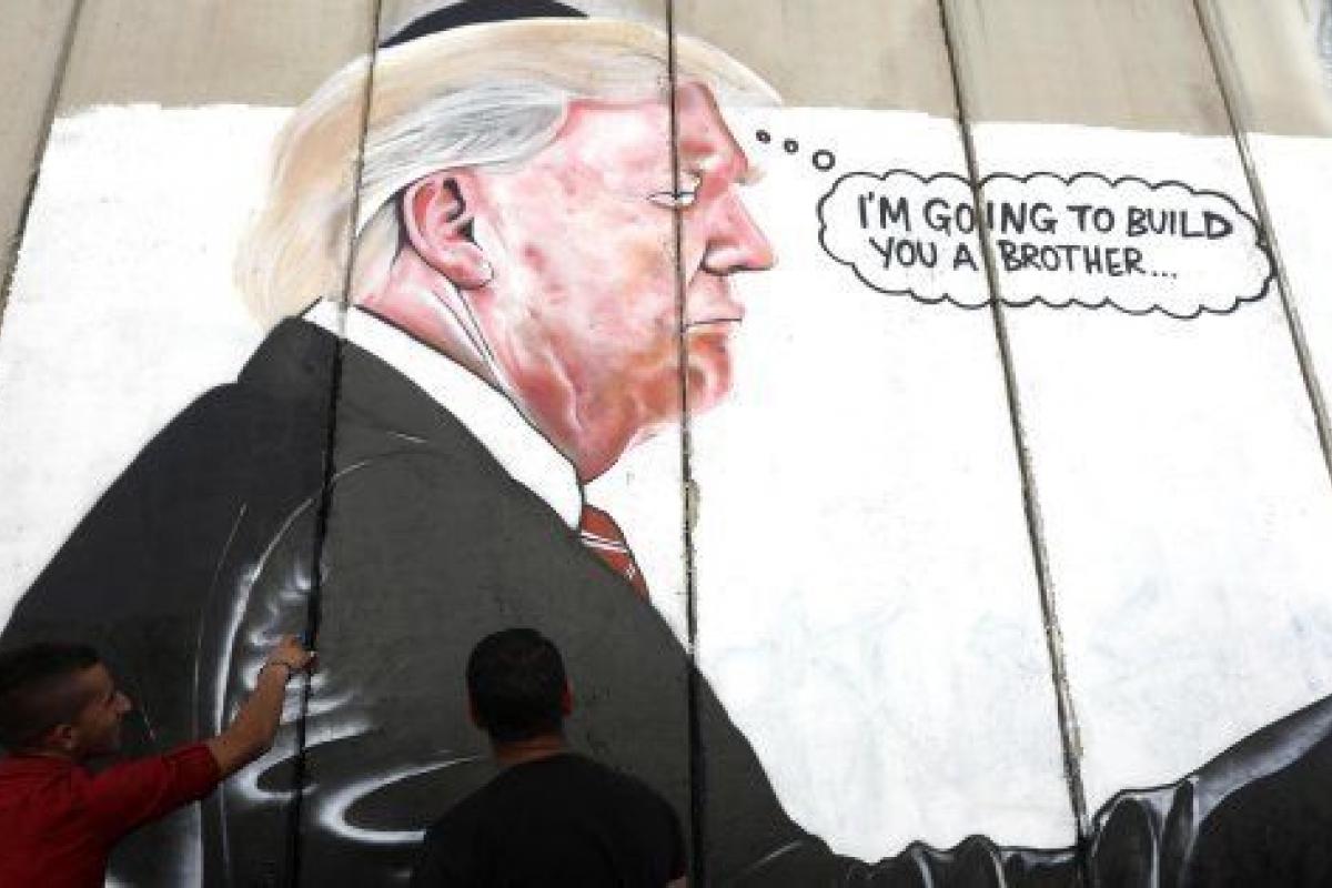 En Belén (Cisjordania), en la parte palestina del muro de cemento que Israel comenzó a construir en 2003, en medio de la segunda intifada palestina, ha aparecido un grafiti gigante en el que está retratado el mandatario norteamericano diciéndole a un muro: "Te voy a construir un hermano. En otra pintada, Trump abraza una torre de vigilancia israelí, con corazoncitos rosas.