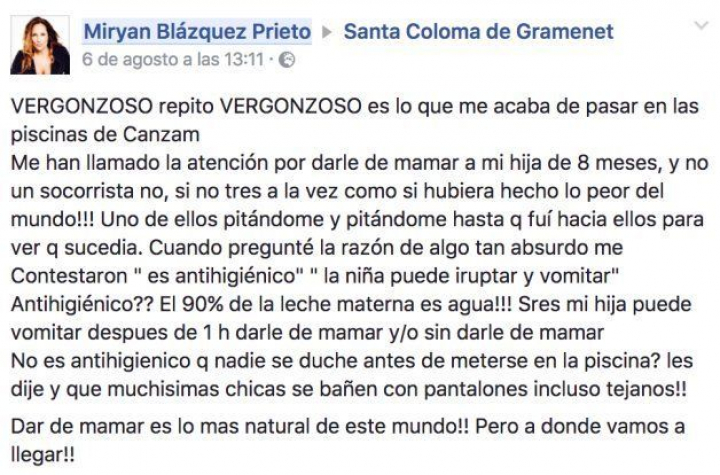 La piscina municipal de Can Zam de Santa Coloma de Gramenet (Barcelona) ha prohibido a una madre dar de mamar a su hija dentro del agua, según ha avanzado El Periódico. Una mujer llamada Miryan Blázquez ha denunciado en Facebook que el pasado 6 de agosto, se disponía a amamantar a su bebé de ocho meses porque "la niña se puso pesada" y se apartó "a un ladito para no molestar a nadie", cuando los socorristas llamaron su atención con el silbato.