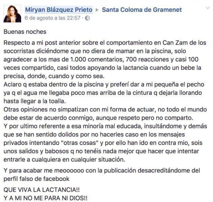 Los socorristas justificaron ante la madre que días atrás ya habían echado a una chica por las mismas circunstancias. Sin embargo, Blázquez ha insistido en que no estaba haciendo nada malo ni sucio. "A mí no me para ni Dios", ha escrito, indignada, en las redes sociales, donde su caso ha logrado mucho eco y más apoyos.