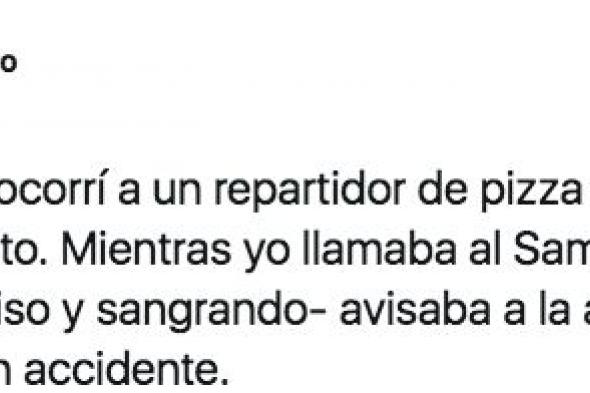 “Hace un rato socorrí a un repartidor de pizza que lo atropelló un auto [coche]. Mientras yo llamaba al Same [Sistema de Atención Médica de Emergencias], el hombre - tirado en el piso [suelo] y sangrando- avisaba a la app que había tenido un accidente. Lo único que le importaba a ellos era el estado de la pizza. Perverso es poco”, cuenta Otero en su perfil de Twitter.