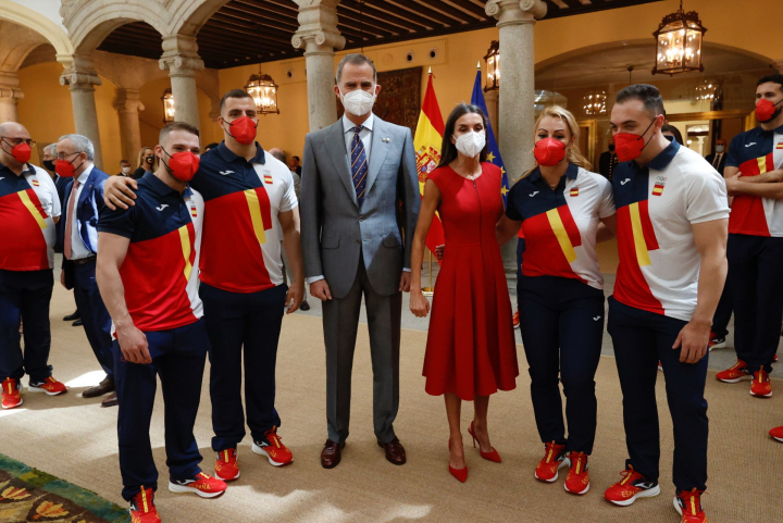 Bunte se refiere a la recepción que los reyes hicieron a una representación de los atletas españoles que participarán en los Juegos Olímpicos de Tokio. La revista dice que en ese acto la reina se puso un “atuendo espectacular que llamó la atención de todos” gracias a un vestido sin mangas rojo que era un “verdadero placer para los ojos”.