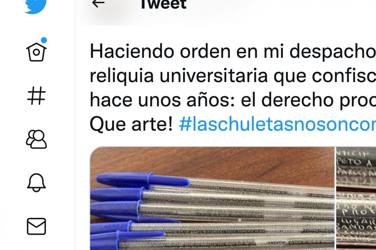 “Haciendo orden en mi despacho he encontrado esta reliquia universitaria que confiscamos a un alumno hace unos años: el derecho procesal penal en bolis bic. Que arte!”, ha escrito en Twitter.