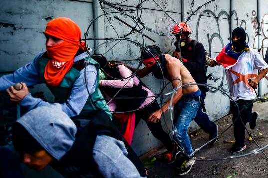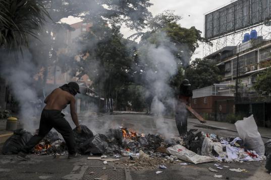 Alcantarillas levantadas, alambres bien tensos y atados en los extremos, muebles descartados, basura y ramas de árbol servían para bloquear vías en la parte oriental de Caracas, al que decenas de jóvenes encapuchados de la llamada "resistencia" al Gobierno impedían amenazantes el paso desde la autopista sin más excepción que las ambulancias.