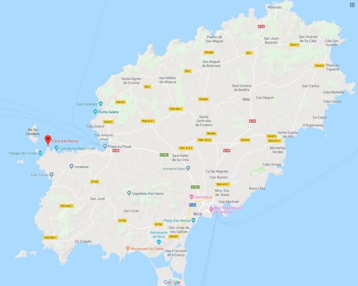 Esta playa virgen es de las más aisladas de Ibiza, pues está situada en una zona montañosa. Su acceso es bastante difícil y se recomienda hacerlo en barco. De arena y grava, sus aguas son tranquilas y de azul intenso.