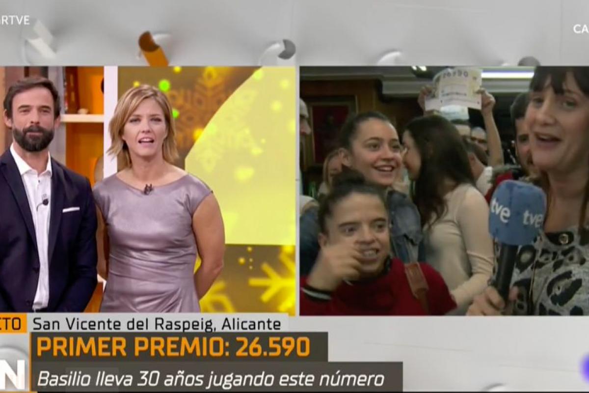 La presentadora, María Casado, ha dado paso a una conexión en directo con San Vicente del Raspeig, en Alicante, donde estaban celebrando que allí había caído el 26.590, ‘El Gordo’ de la Lotería de Navidad.