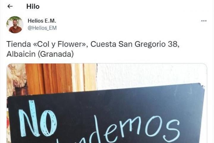 La tienda de Granada Col&Flower se ha convertido en un fenómeno viral en Twitter gracias al cartel que ha colocado a la entrada del establecimiento y que ha subido a esa red social el usuario @Helios_EM.