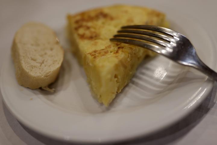 El plato tiene un poco de todo menos de tortilla de patata: patatas fritas de bolsa, tortilla francesa, verduras con tomate e, incluso para rematar, un gajo de naranja.