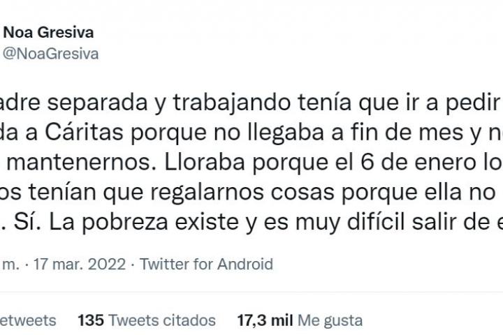 “Mi madre separada y trabajando tenía que ir a pedir comida a Cáritas porque no llegaba a fin de mes y no podía mantenernos. Lloraba porque el 6 de enero los vecinos tenían que regalarnos cosas porque ella no podía. Sí. La pobreza existe y es muy difícil salir de ella”, ha escrito la usuaria.