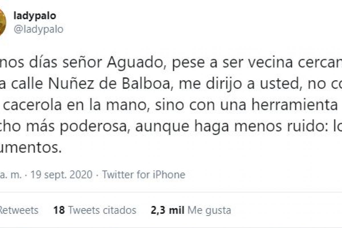 La tuitera y vecina del barrio de Salamanca de Madrid LadyPalo (@ladypalo) se ha convertido en tendencia en Twitter tras la carta que le ha enviado al vicepresidente de la Comunidad de Madrid, Ignacio Aguado.