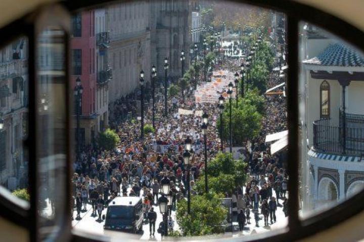 Antes de iniciar el recorrido, los padres de Marta, Antonio del Castillo y Eva Casanueva, y su abuelo materno, José Antonio Casanueva, han dejado un ramo de flores a las puertas de los juzgados de Sevilla, acompañados por una veintena de los manifestantes y personas que, a título personal, se han unido al pequeño homenaje.