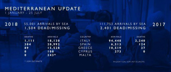 En total, alrededor de 55.000 inmigrantes han llegado a las costas europeas en 2018, frente a más del doble de esa cantidad que en el mismo periodo del año pasado -111.753 personas-, ha indicado.