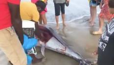 Ayudándose de cuerdas y tirando de los cuernos del animal, estos cuatro ciclistas tiran con todas sus fuerzas para sacarlo del agua.