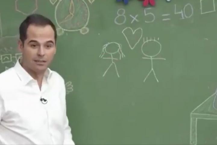 Allí, el dirigente de Ciudadanos tuvo que explicar a los pequeños de dónde vienen los niños. Y no se le vio muy cómodo. Empezó dibujando en la pizarra dos muñecos, uno de un hombre y otro de la mujer, entre los que situó un corazón.
