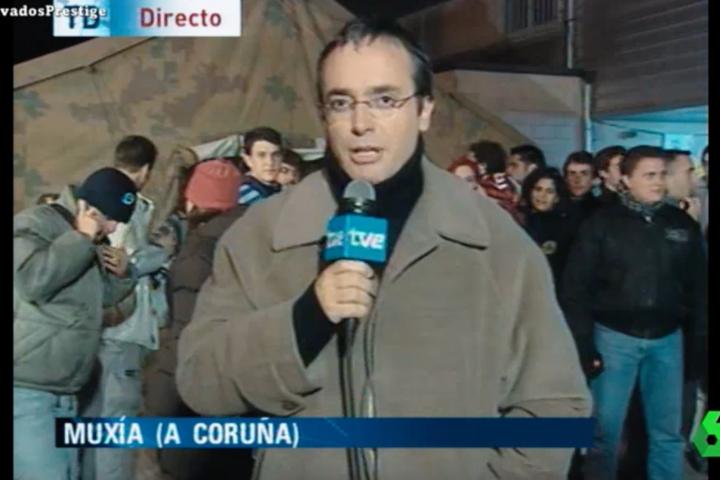Pero volvamos al directo de Urdaci. Todo preparado para arrancar e informativo. Urdaci a pie de obra, como os buenos periodistas de raza que van al lugar de la noticia, Letizia Ortiz, que trabajaba con él, Almudena Ariza, reportera de a casa, todos listos. Empieza el directo. Los mariscadores sin faenar, las playas negras, los gallegos hastiados, enfadados, airados, el chapapote tiñéndolo todo… Y de pronto, un grupo nutrido de voluntarios y afectados se coloca en el lugar indicado para boicotear el directo de Urdaci.