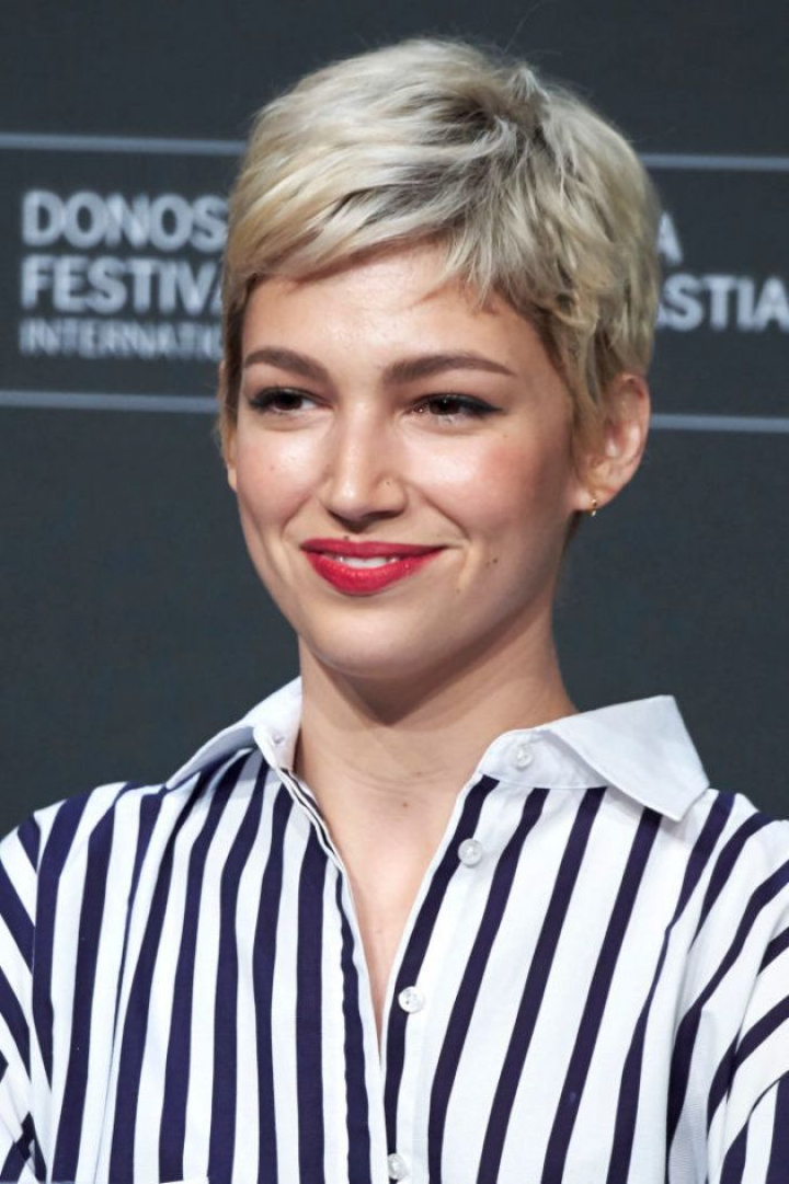 Corberó, que hasta hace pocos días se dejaba ver castaña, con una melena corta muy desfilada y flequillo recto, ha cambiado totalmente: ahora es rubia, casi platino, y se atreve con un corte pixie, es decir, muy corto y punteado.