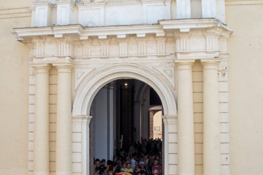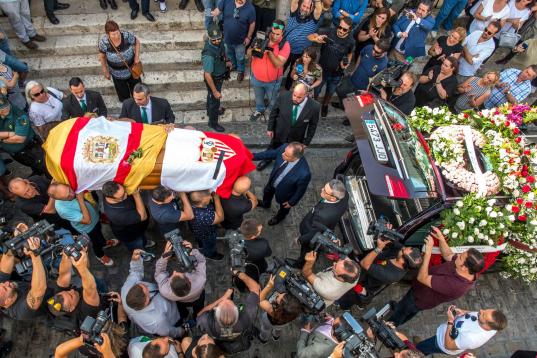 El cadáver de Reyes fue velado toda la noche en el Ayuntamiento utrerano, del que salió a las nueve de la mañana de este lunes hacia el templo cubierto con una bandera del Sevilla -el club en el que se formó y en cuyo primer equipo militó ocho temporadas divididas en dos etapas- y una enseña nacional.