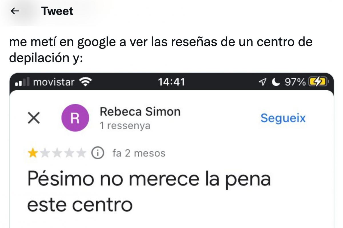 “Me metí en google a ver las reseñas de un centro de depilación y...”, dice en el tuit que va camino de nada más y nada menos de superar los 91.000 ‘me gusta’ en poco más de un día.