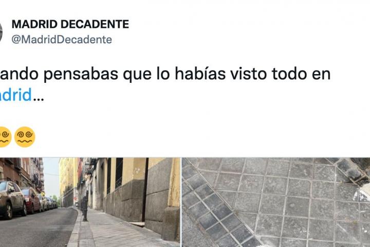 La cuenta de Twitter Madrid Decadente @MadridDecadente ha compartido dos fotografías de una calle de la capital de España en cuya acera ha aparecido algo sorprendente.