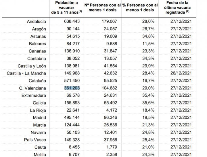 En dos semanas casi uno de cada cuatro niños ya ha recibido la vacuna pediátrica contra el coronavirus. Sanidad ha compartido las cifras actualizadas hasta el 27 de diciembre y ya cuenta con un 24,6% entre 5 y 11 años con la primera dosis puesta. Eso son 822.789 de los 3.349.276 pequeños a proteger.