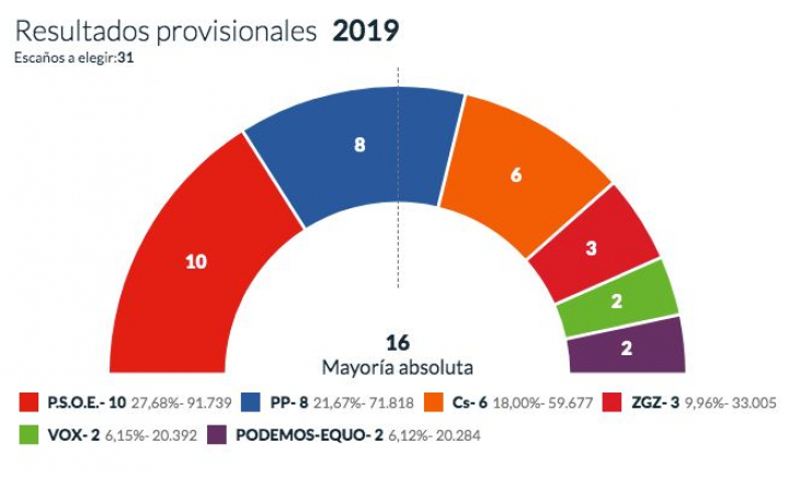 Aunque el PSOE es la primera fuerza con diez concejales, PP, Ciudadanos y Vox podrían reeditar su pacto andaluz y recuperar la capital de Aragón con ocho, seis y dos regidores cada uno, con unos resultados que dejan fuera a CHA, que contaba con dos concejales en 2015.