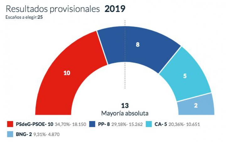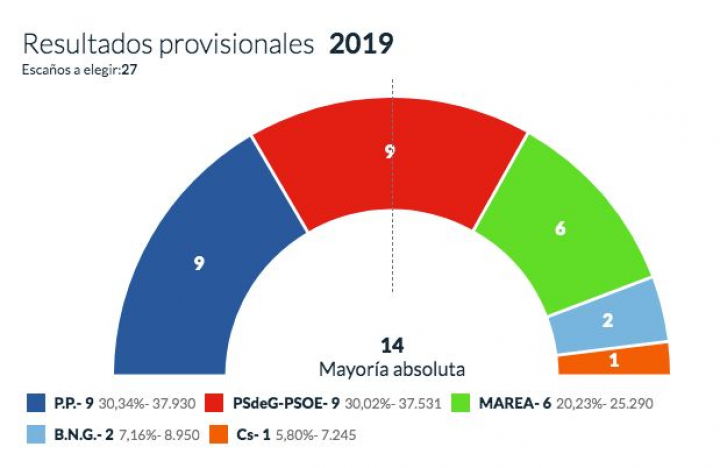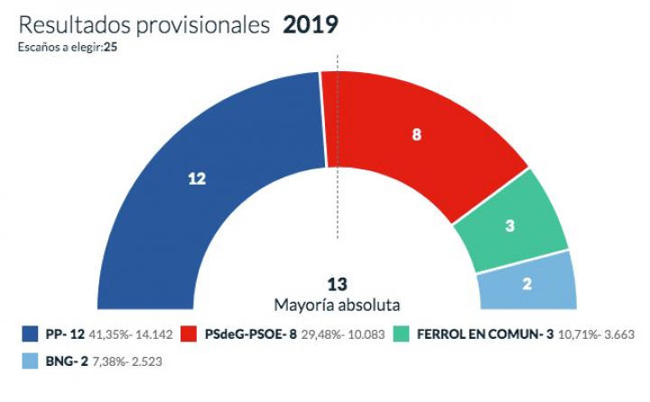 El PP ha conseguido ser el partido más votado, con 12 escaños, pero le falta un escaño para la mayoría absoluta y es difícil que encuentre un aliado entre los 8 concejales del PSOE y dos del BNG.