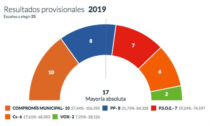 En Valencia, el alcalde Joan Ribó podrá revalidar el mandato municipal otros cuatro años, al haber conseguido 10 concejales Compromìs, uno más que en 2015 si le apoyan los siete ediles del PSOE, dos más que en las anteriores.
