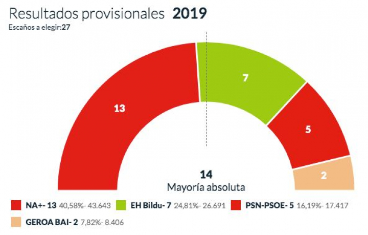Aunque Navarra Suma es la primera fuerza en Pamplona, con 13 concejales, los pactos se antojan difíciles, ya que Bildu, hasta ahora en el poder, con Joseba Asiron como alcalde, se queda en siete concejales, por los cinco del PSOE y dos de Geroa Bai que hasta ahora gobernaba.