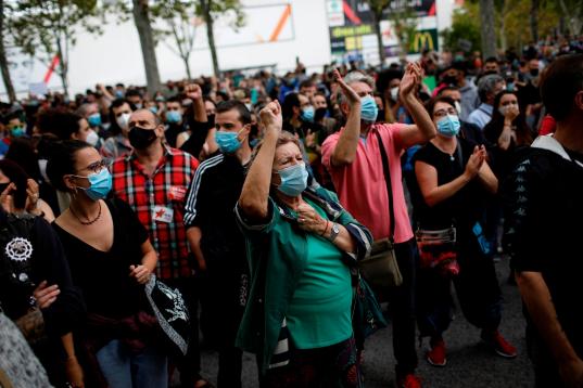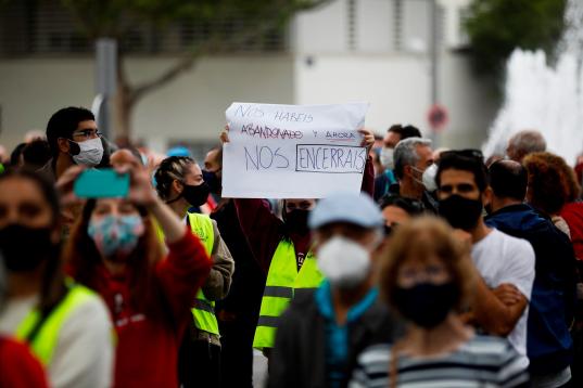 Por su parte, los manifestantes han proclamado consignas en favor de la Sanidad pública y han sostenido pancartas en las que se podía leer “Menos curas, más vacunas”, “más hospitales y menos militares” y han pedido la dimisión de la presidenta de la Comunidad de Madrid, Isabel Díaz Ayuso.