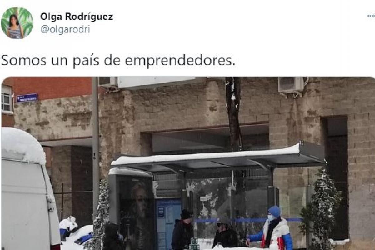 La comunicadora ha colgado en su perfil de Twitter lo que ha visto en una marquesina de autobuses. Un grupo de personas ha apilado nieve como si fuera la barra de un bar, incluso la han catalogado así. Para darle más presencia, también han puesto varias cervezas encima.