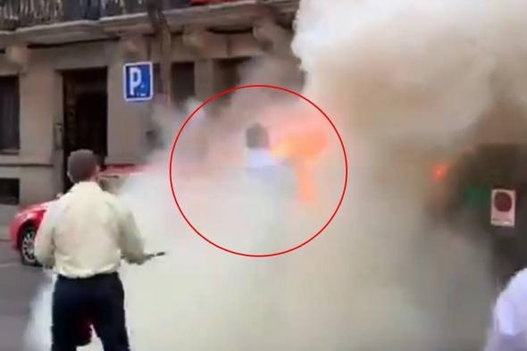 En las imágenes facilitadas por Vox se puede ver como varios miembros del partido, entre ellos Javier Ortega Smith, acuden a la zona con extintores y logran apagar las llamas que afectaban a un contenedor de basura.