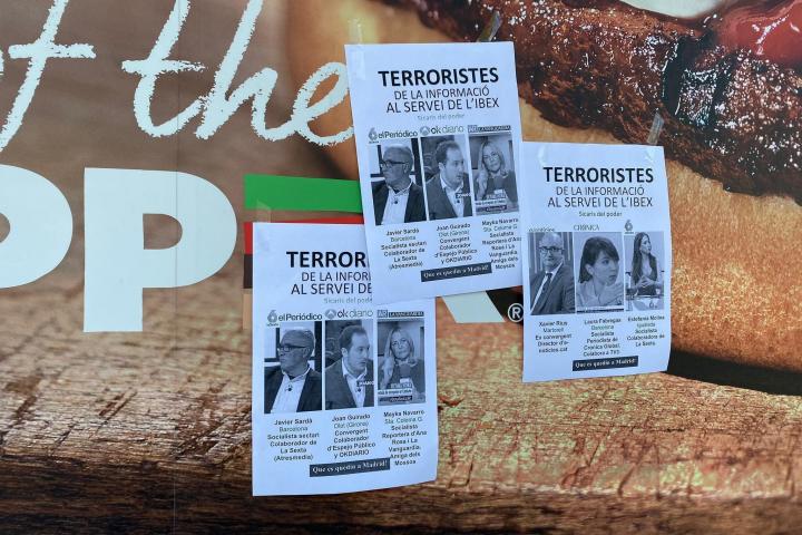 Varios periodistas catalanes han lamentado la aparición de unos carteles anónimos con las leyendas en catalán “Terroristas de la información al servicio del Ibex” y ”¡Que se queden en Madrid!” junto a la imagen de seis profesionales y el nombre de medios en que colaboran.