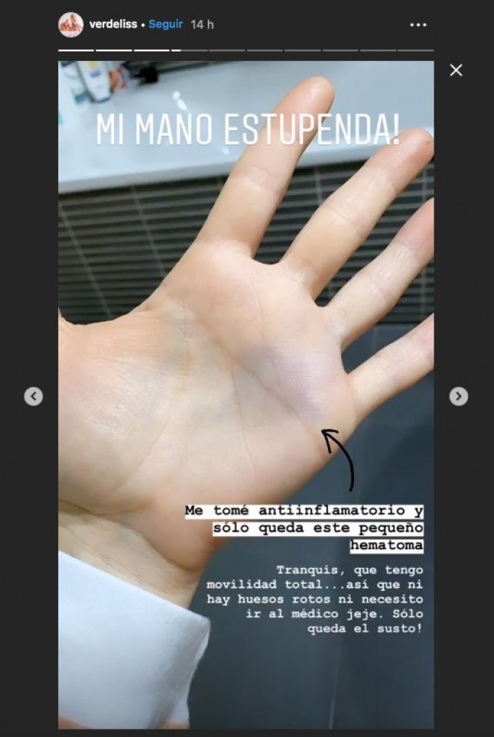 Horas después Verdeliss compartió otra imagen de su mano para tranquilizar a sus fans. La youtuber escribió que estaba “estupenda” tras tomarse antiinflamatorio.