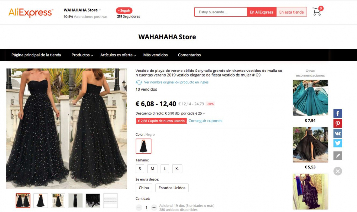 La colaboradora de Sálvame llevó un vestido largo, negro y con lunares blancos que aparece en esta web con la siguiente descripción: “Vestido de playa de verano sólido Sexy talla grande sin tirantes vestidos de malla con cuentas verano 2019 vestido elegante de fiesta vestido de mujer”.