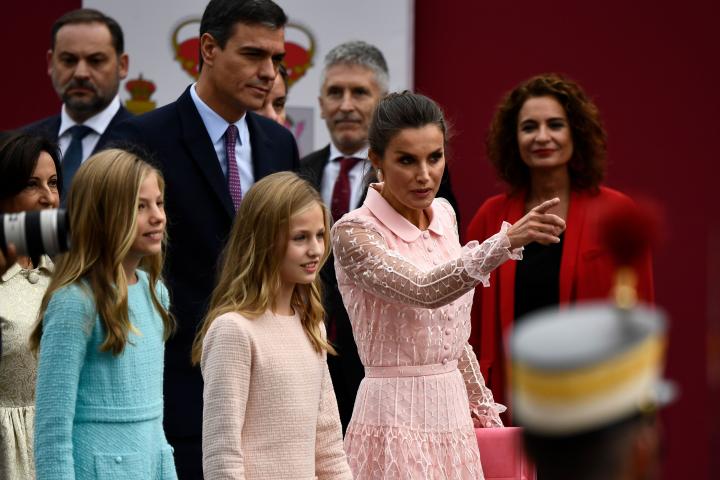 Spain´s Queen Letizia (R), princess Leonor (C), princess Sofia (L) and Spanish Prime Minister Pedro Sanchez (back) arrive to attend the Spanish National Day military parade in Madrid on October 12, 2019. (Photo by OSCAR DEL POZO / AFP) (Photo b...