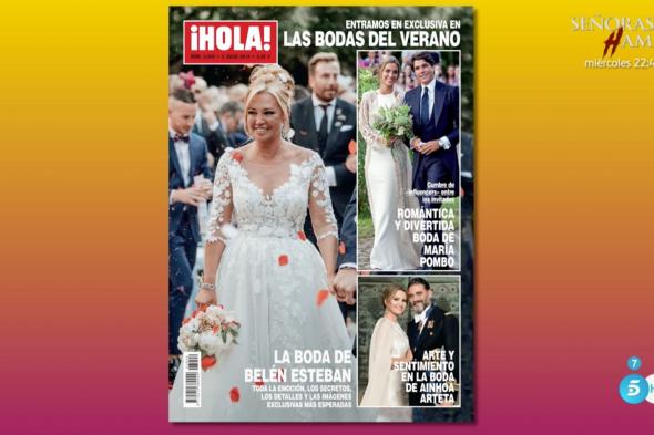 Llegó el momento. Sálvame ha adelantado este martes la portada de ¡Hola! con Belén Esteban vestida de novia. La colaboradora del programa de Telecinco aparece sola en la imagen, sin el marido, Miguel Marcos, al que tapan los dos cuadros laterales: con la boda de María Pombo y con la de Ainhoa Arteta. Solo se le ve la mano derecha en la que ya luce el anillo de casado