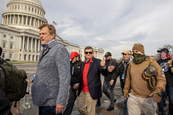 Flynn sugirió que Trump podría incautarse de las máquinas de contar votos y declarar la ley marcial para “repetir las elecciones”; eso sí, solo en los estados en los que había perdido. También advirtió en repetidas ocasiones de que estaba a punto de producirse una injusticia histórica que debía ser detenida, una narrativa que reprodujeron muchos de los asaltantes del Capitolio.