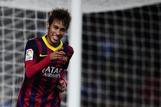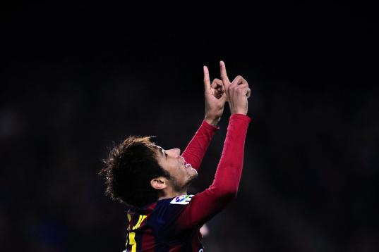 El breasileño Neymar, del Barcelona, festeja su gol contra el Cartagena, durante un encuentro de la Copa del Rey, el martes 17 de diciembre de 2013 (AP Foto/Manu Fernández)