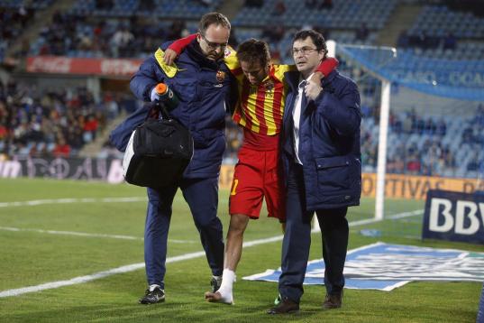 El brasileño Neymar, del Barcelona, se retira lesionado de un partido por la Copa del Rey ante el Getafe en el estadio Alfonso Pérez, en Madrid, España, el jueves 16 de enero de 2014. Barcelona, que ganó 2-0, dijo que Neymar sufrió un esgui...