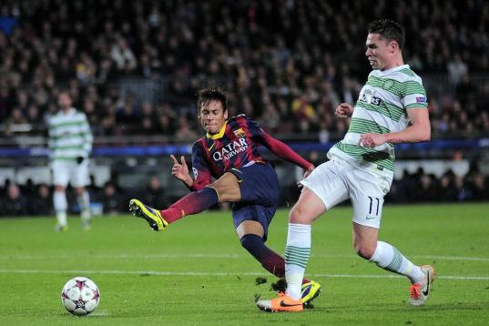 El jugador del Barcelona, Neymar, izquierda, remata el balón en un partido contra Celtic por la Liga de Campeones el miércoles, 11 de diciembre de 2013, en Barcelona, España. (AP Photo/Manu Fernandez)