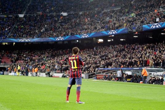 El brasileño Neymar, del Barcelona, mira a la multitud luego de anotar su tercer gol durante un partido del Grupo H de la Liga de Campeones contra el Celtic en el Camp Nou, en Barcelona, España, el miércoles 11 de diciembre de 2013. El Barcel...
