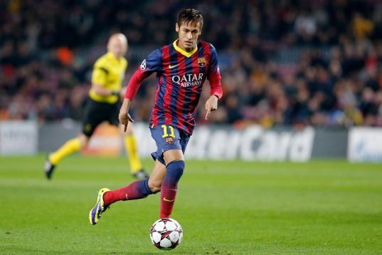 FC Barcelona's new signing Neymar controls the ball during his official presentation at the Camp Nou stadium in Barcelona, Spain, Monday, June 3, 2013. Neymar arrived in Barcelona on Monday to complete his deal with the Catalan club, which will ...