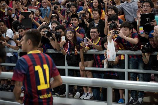 FC Barcelona's Neymar (front) is cheered by his fans as he enter the pitch to play their exhibition match against Thailand's national football team at the Rajamangala football stadium in Bangkok on August 7, 2013. AFP PHOTO/ Nicolas ASFOURI ...