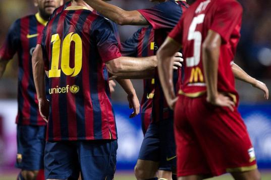 FC Barcelona's Lionel Messi (2nd L) and Neymar (2nd R) celebrate after scoring against Thailand during their exhibition match with Thailand's national football team at the Rajamangala football stadium in Bangkok on August 7, 2013. AFP PHOTO/ Nic...