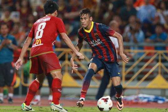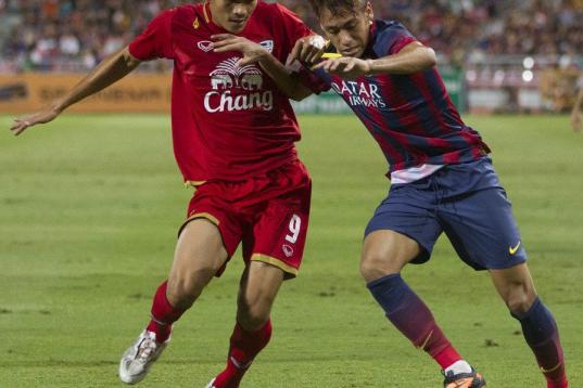 Thailands Adsak Kraisorn left , fights for the ball with FC Barcelonas Neymar during their friendly soccer match at Rajamangala national stadium in Bangkok, Thailand Wednesday, Aug . 7 , 2013. FC Barcelona beat Thailand 7-1.(AP Photo/Sakchai...