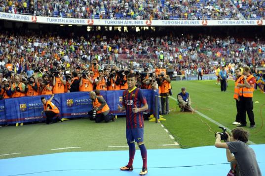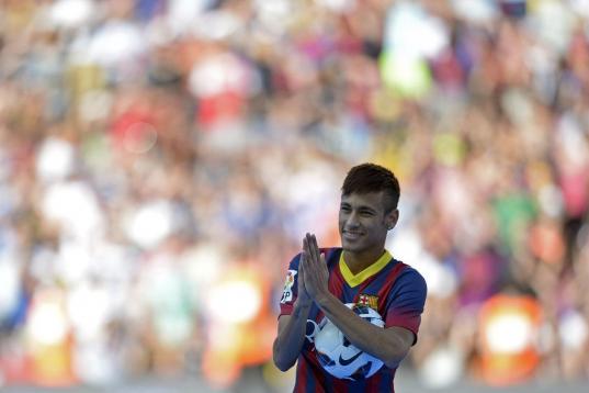 FC Barcelona's new signing Neymar gestures waves to the crowd during his official presentation at the Camp Nou stadium in Barcelona, Spain, Monday, June 3, 2013. Neymar arrived in Barcelona on Monday to complete his deal with the Catalan club, w...